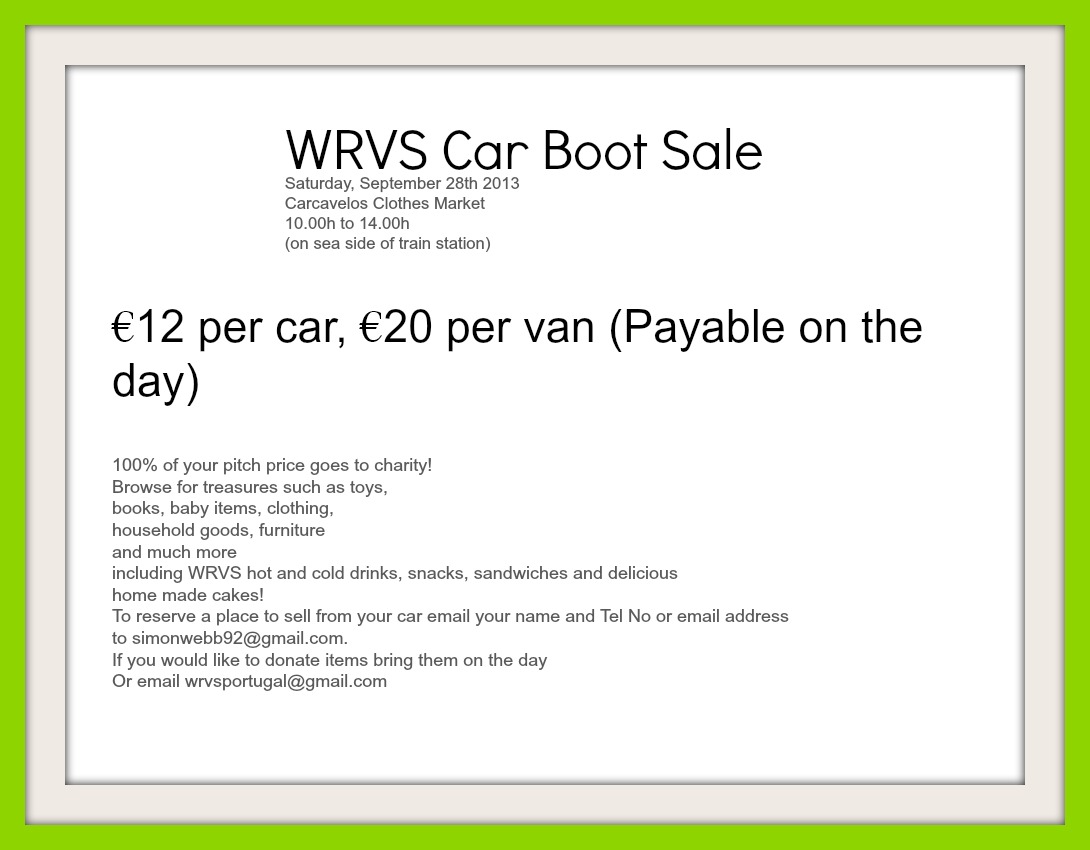 A WRVS faz anualmente um CAR BOOT que nada mais é que uma supervenda em carros! Sim! ISSO TAMBÉM EXISTE! Vários carros com as suas tralhas lá dentro, juntos no mesmo estacionamento a vender, boa? Acontece no lugar onde é semanalmente a feira de Carcavelos.
